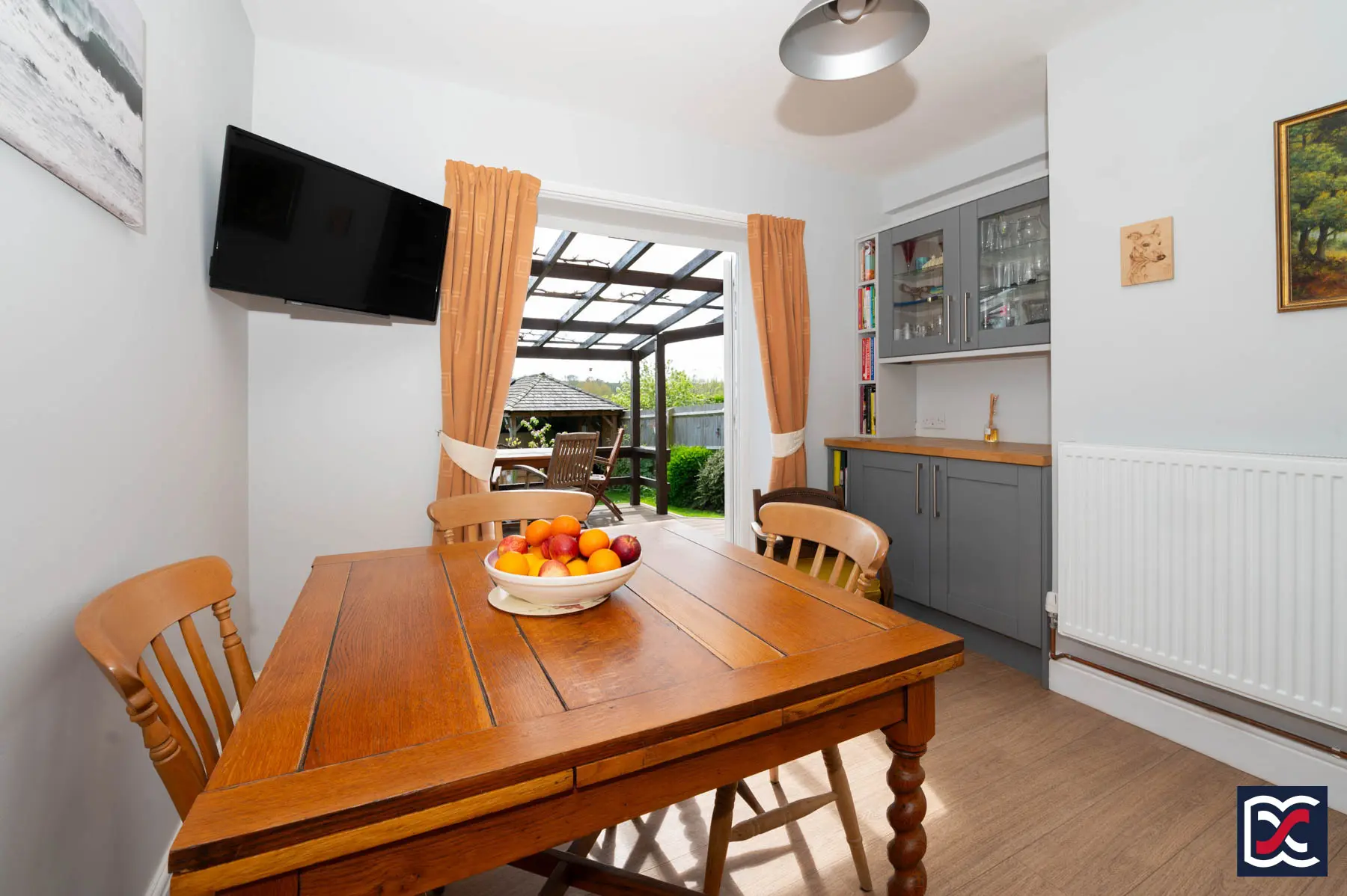 The dining room enjoys a particularly attractive south-facing outlook over the rear garden, adjoining pastureland and the canal beyond. French doors open directly onto the pergola-covered decked terrace, creating a natural extension of the room and allowing for an easy connection between inside and out. There is space for a good-sized dining table and chairs, while a bespoke Shaker-style fitted cabinet with oak top, together with a glazed wall unit above, provides useful built-in storage and display space for crockery, glassware and tableware.