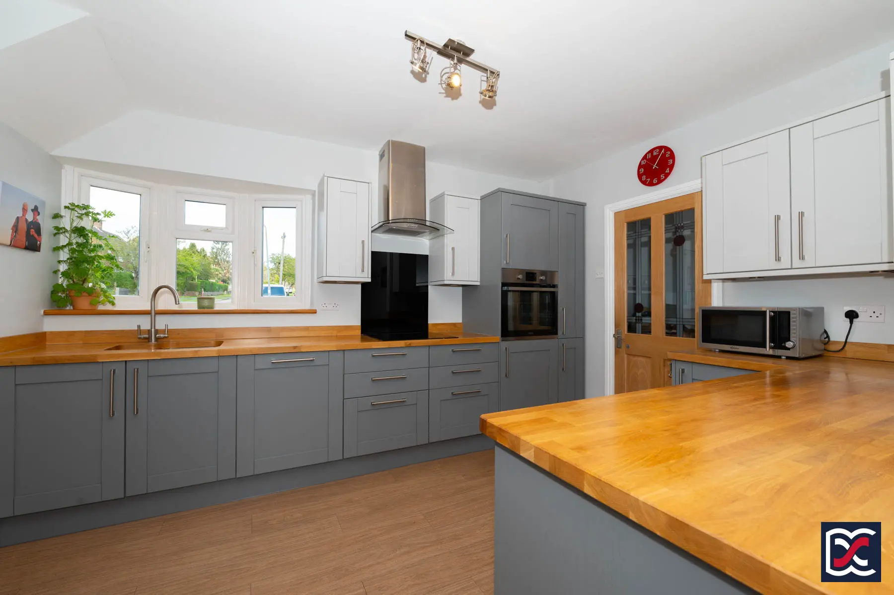 The room is fitted with a range of Shaker-style base and wall units with solid oak work surfaces and matching upstands. A one-and-a-half bowl inset sink with brushed chrome mixer tap is positioned beneath the bay window, while integrated appliances include a Neff four-burner induction hob with extractor above, an electric oven and a dishwasher. There is also space for a full-height fridge freezer, and a breakfast bar provides an area for informal dining. The flooring is finished in oak-effect laminate to complement the entrance hall, and a part-glazed oak panel door opens to the main entrance hall.