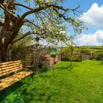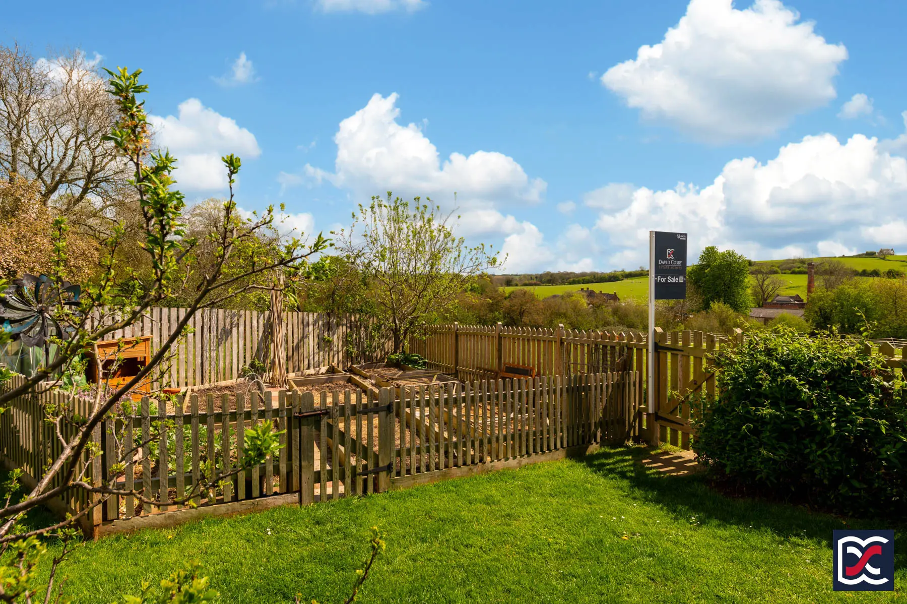 Beyond, the principal part of the garden is laid to lawn and enclosed by close-board fencing, with a mid-height picket fence marking the rear boundary. A traditional picket gate opens directly onto the footpath beyond, giving convenient access to the surrounding countryside and canal-side walks.