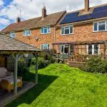 The rear garden is arranged over two levels and is a particular feature of the property, taking full advantage of its elevated position and south-facing aspect. Immediately to the rear of the house is a raised composite deck, with steps descending to the main garden. A pergola extends across much of the rear elevation, creating a sheltered seating and entertaining area and linking directly with the house via French doors from the dining room and a glazed door from the utility area, with views out towards the Oxford Canal and adjoining pastureland.