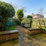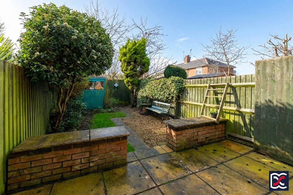 To the rear is a well-kept, enclosed garden with a paved patio providing practical outdoor seating for dining and entertaining. Facing brick retaining walls create a clear division between the terrace and the main garden where a step leads down to an attractive central lawn and a gravelled seating area, framed by mature hedgerows and a selection of low-level trees. A timber potting shed provides useful storage, and there is gated pedestrian access via a path running along the rear of the terrace.