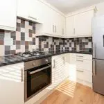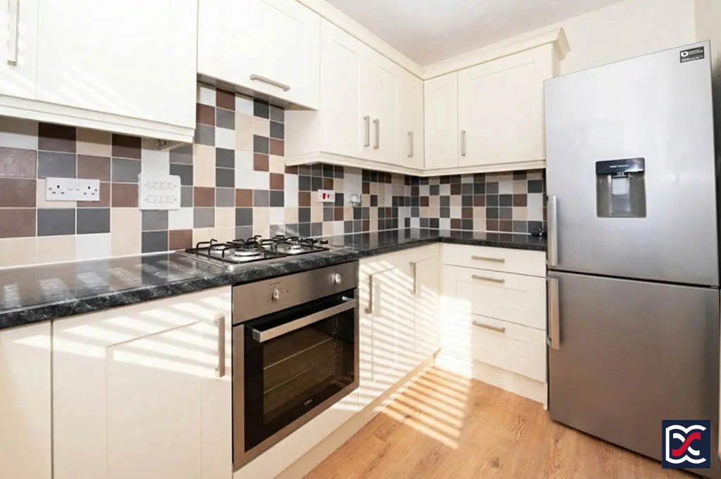 Located to the front left-hand side of the property, the kitchen is naturally lit by a front-facing window and is fitted with a range of Shaker-style base and wall units finished with black quartz-effect roll-edge work surfaces. A one-and-a-half bowl stainless-steel sink with chrome mixer tap sits beneath the window, and there is an electric oven with four-burner gas hob and extractor hood over. There is space for a tall fridge/freezer and a washing machine. Flooring continues in oak-effect laminate, with off-white walls and ceramic splashback tiling above the worktops.