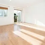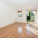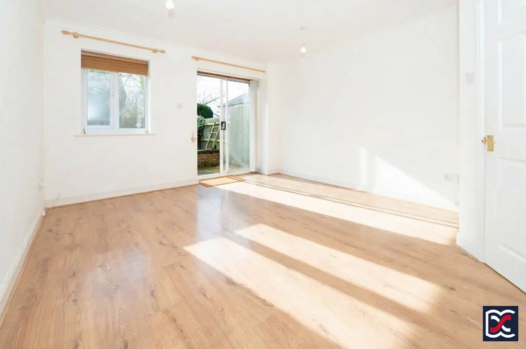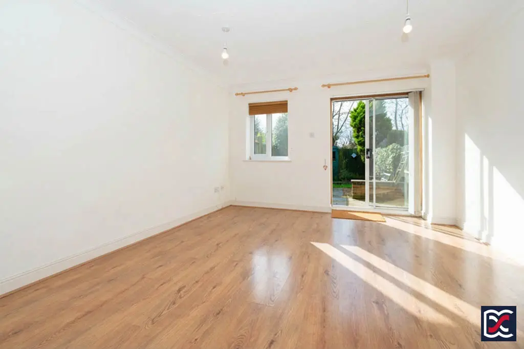A generous rear-facing reception space, naturally lit by a two-pane casement window and a glazed sliding door opening onto the patio. The room is finished with oak-effect laminate flooring and neutral décor, complemented by perimeter ovolo coving. There is comfortable space for soft seating as well as a table and chairs for informal dining.