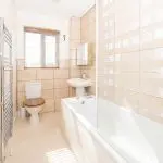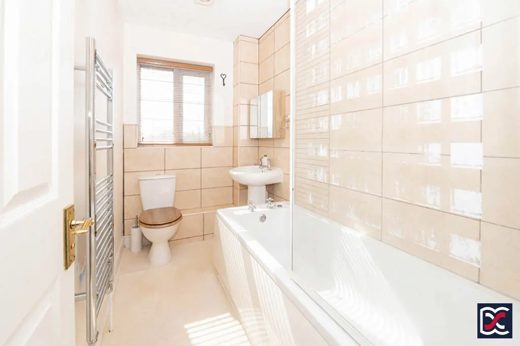 The bathroom is fitted with a modern three-piece suite comprising a white panelled bath with chrome pillar taps and wall-mounted shower, a pedestal wash hand basin with matching taps, and a close-coupled WC. Walls are finished with part full-height ceramic tiling, with the remaining areas in neutral emulsion. Flooring is laid in a terrazzo-style sheet vinyl. Natural light is provided via a rear-facing frosted casement window, and mechanical extract ventilation is installed. A chrome ladder-style towel rail provides heated towel storage.