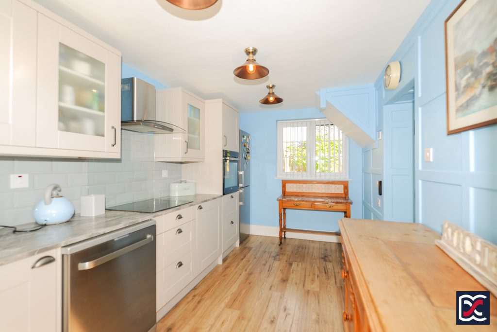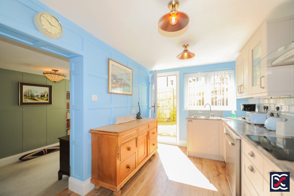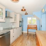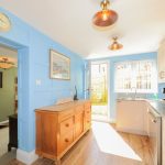 The dual aspect kitchen is fitted with a range of modern Shaker-style units incorporating a stainless-steel inset sink and drainer, induction hob with brushed chrome carbon filter over, and an integral electric oven. The space is well lit with double glazed windows to both the west and east facing elevations providing good sunlight throughout the whole day. Floors are finished with oak effect boards and there is space for a full height fridge/freezer. Chamfered ceramic metro tiles have been formed above the base units and the front wall has been finished with traditional full height timber panelling. A part-glazed door provides access onto the rear garden.