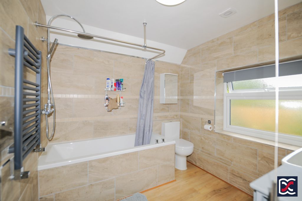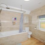 The family bathroom is a spacious area with full height marble effect wall tiles and water-resistant oak effect floor boards. It is fitted with a contemporary 3-piece suite comprising double ended bath with rainfall shower rose and separate shower hose, close coupled WC, and ceramic wash hand basin with pedestal. Heating is provided by a ladder towel rail and good natural lighting and ventilation is provided by a frosted double glazed casement window.