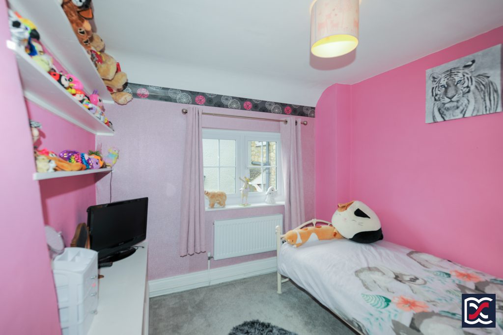 Bedroom three is a single bedroom with two unit double glazed window overlooking the side garden. It is also brightly decorated with part motif wallpaper, and incorporates integral timber shelving to the chimney breast niche.