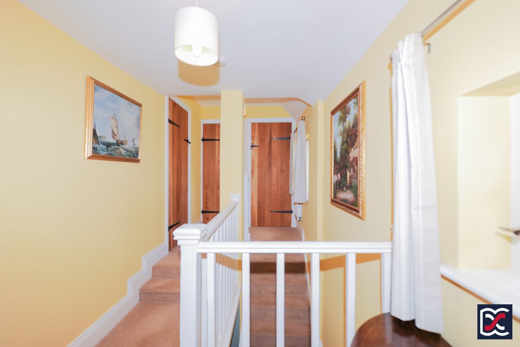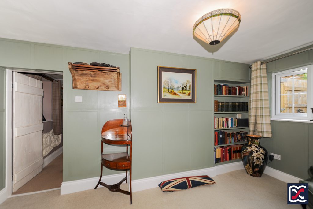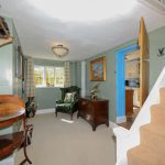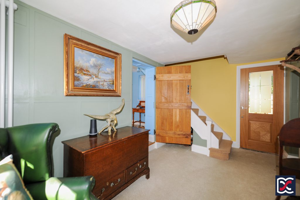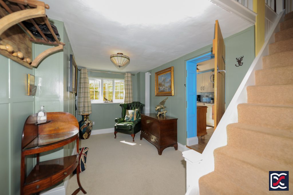 The entrance porch opens into the central reception room which is currently used as a study area but would accommodate a large table and chairs for a dining room. Walls are sympathetically finished with full height timber panelling. Space heating is from a full height column radiator and natural lighting is provided by a three-unit, double-glazed casement window overlooking the side garden. Floors are finished with plush cut pile carpet. A solid oak door which is fitted with wrought iron T-bar hinges and a Suffolk latch provides access to the kitchen and there is a straight flight of carpeted stairs leading to the first-floor accommodation.
