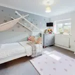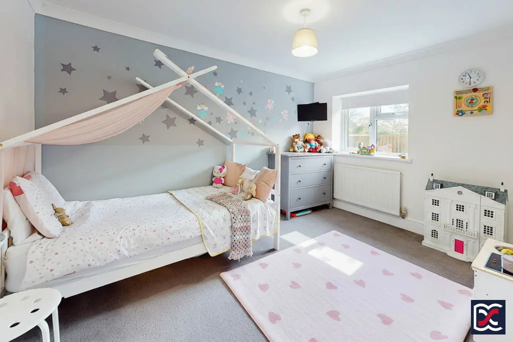 A smaller double bedroom, currently used as a nursery with decorative motif walls, perimeter coving, and cut-pile carpet. Natural light is provided by a casement window to the side aspect.