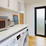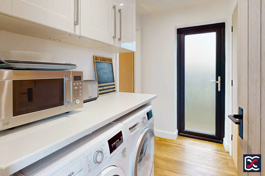 Positioned to the left-hand side of the property, the utility area is fitted with roll-top work surfaces and provides space and plumbing for a washing machine and tumble dryer, with additional storage available within a three-unit wall-mounted cupboard above. The flooring continues in matching oak-effect Karndean boards, maintaining consistency with the main living area. A frosted full-height double-glazed door with a three-point locking mechanism provides pedestrian access to the side of the property. A large built-in cupboard houses the floor-mounted Grant boiler and hot water cylinder, with further space for general storage. A panelled door leads through to the home study.