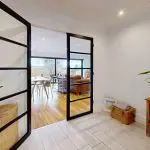 Centrally positioned within the property, the entrance hall provides access to all principal rooms. White panelled doors open to the bedrooms, bathroom, and a separate shower room with WC, while contemporary glazed aluminium double doors lead through to the spacious open-plan living area. The floor is finished with grey timber-effect ceramic tiles, and the walls are neutrally decorated with perimeter ovolo coving. A large recessed area provides useful space for coats and boot storage.