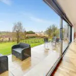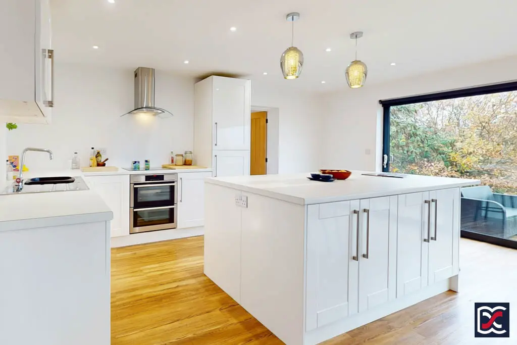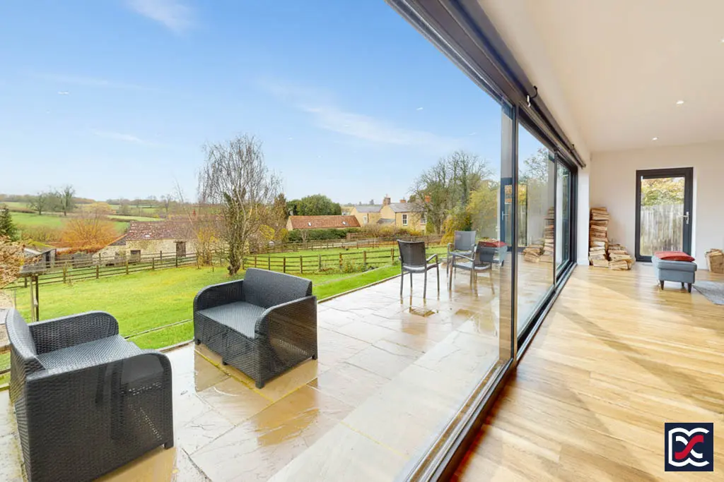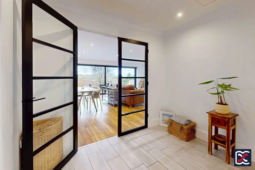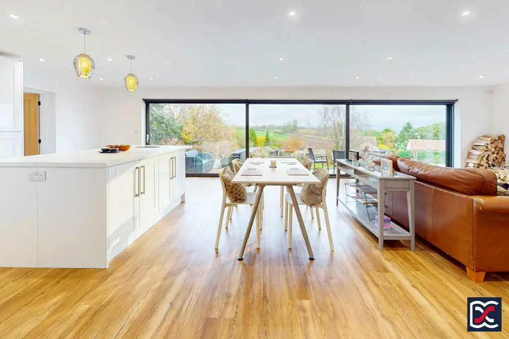 Taking full advantage of the property’s elevated position and attractive outlook, the full-width open-plan living area combines three distinct spaces — sitting, dining, and kitchen — each with individually controlled recessed ceiling lighting. The floor is finished throughout with oak-effect Karndean boards and full-width sliding patio doors span the rear elevation, opening to the garden terrace and framing the panoramic countryside views beyond. The space provides an ideal setting for entertaining or simply relaxing while enjoying the scenery.