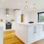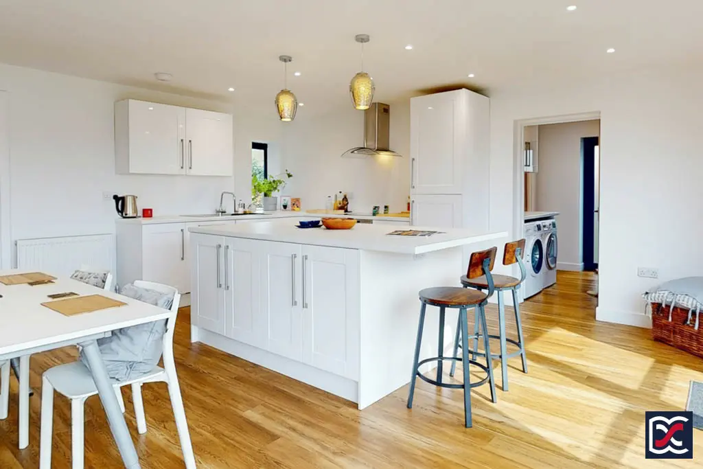 The kitchen, located to the left-hand side, is fitted with a range of white Shaker-style base and wall units. Appliances include a AEG four-zone induction hob, and two-door electric oven beneath a chrome extractor hood with integral lighting. A matching central island provides additional workspace and storage with an extending breakfast bar for informal dining.