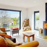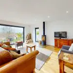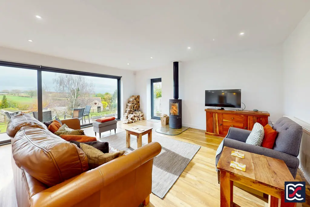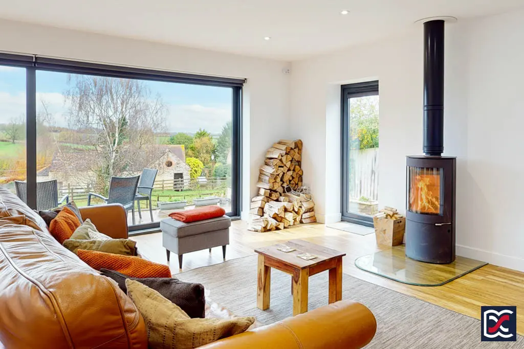 The sitting area, positioned to the right-hand side, features a cylindrical multi-fuel stove with a vertical flue — a focal point that enhances the room’s comfort during colder months.