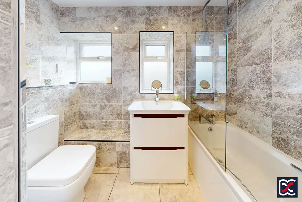 Fitted with a contemporary three-piece suite comprising a bath with chrome shower hose and separate shower rose enclosed by a tempered glass screen, close-coupled WC, and a large ceramic wash hand basin set above a two-drawer vanity unit. The walls are finished in full-height marble-effect ceramic tiling with matching floor tiles and heating is provided by a chrome ladder-style towel rail. Two frosted casement windows provide natural light and ventilation, complemented by an additional mechanical extract system.