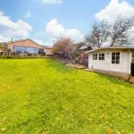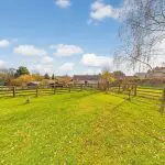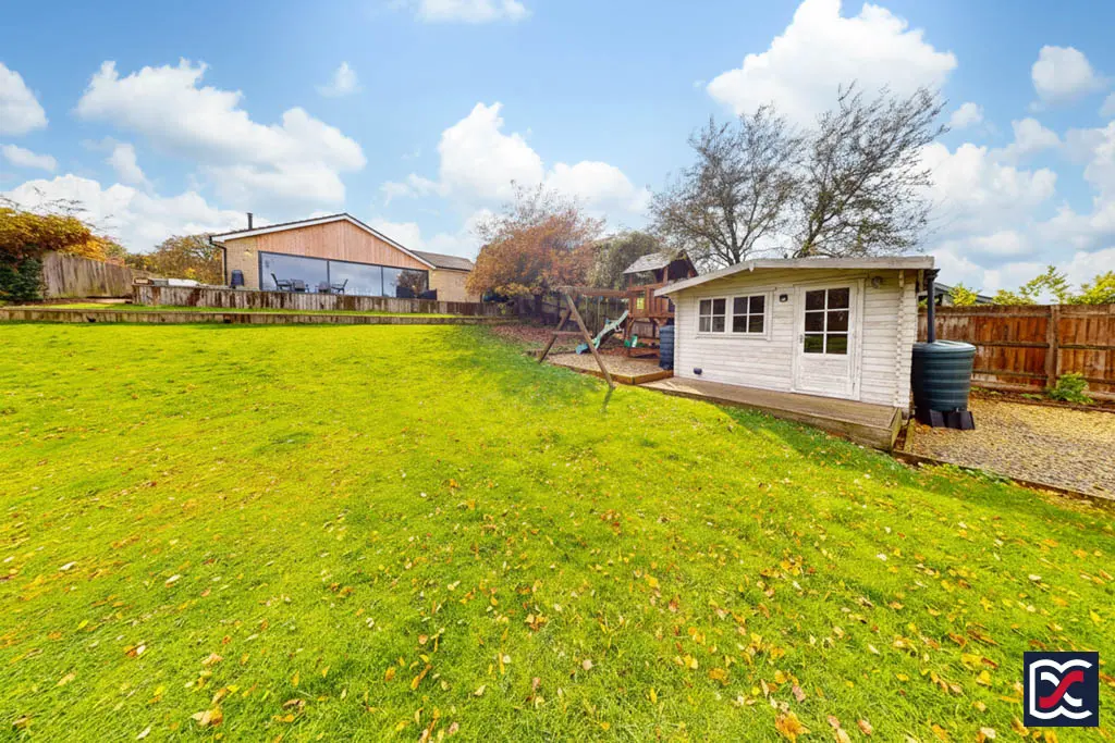 The patio extends along the right-hand side of the property, where double gates open onto the gravelled parking area, and a pathway leads down to the lower garden. To the rear left-hand corner, a timber summer house and children’s play area create an attractive and versatile family space.