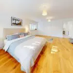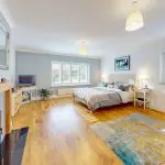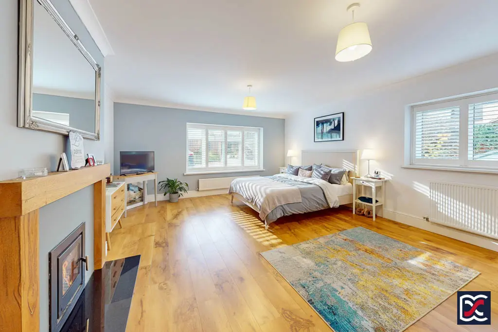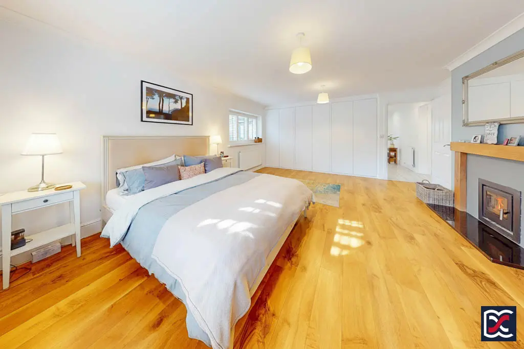 Bedroom One is a dual-aspect double room located to the front left-hand side of the property, with windows to the front and side elevations providing excellent natural light. The floor is finished with quality oak-effect Karndean boards, and the walls are decorated in two-tone emulsion. There is ample space for freestanding bedroom furniture, together with a large five-door built-in wardrobe offering generous storage. A recessed multi-fuel stove with an oak surround and polished tiled hearth forms an attractive focal point, creating a warm and inviting atmosphere for cosy evenings.