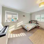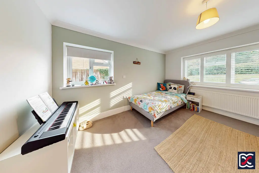 A further dual-aspect double bedroom located to the front right-hand side of the property, with two windows providing good natural light. The walls are finished in two-tone emulsion with perimeter coving, and the floor is laid with a cut-pile carpet. The room offers space for freestanding bedroom furniture.