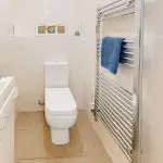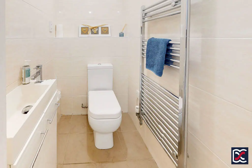 Accessed from the entrance hall, the shower room features a double-width shower enclosure with tempered sliding glass screen, together with a close-coupled WC and a ceramic wash hand basin set above a two-door vanity unit. The walls are part-tiled with matching ceramic floor tiles, and heating is provided by a chrome ladder-style towel rail. Mechanical extract ventilation has also been installed.