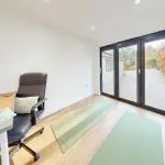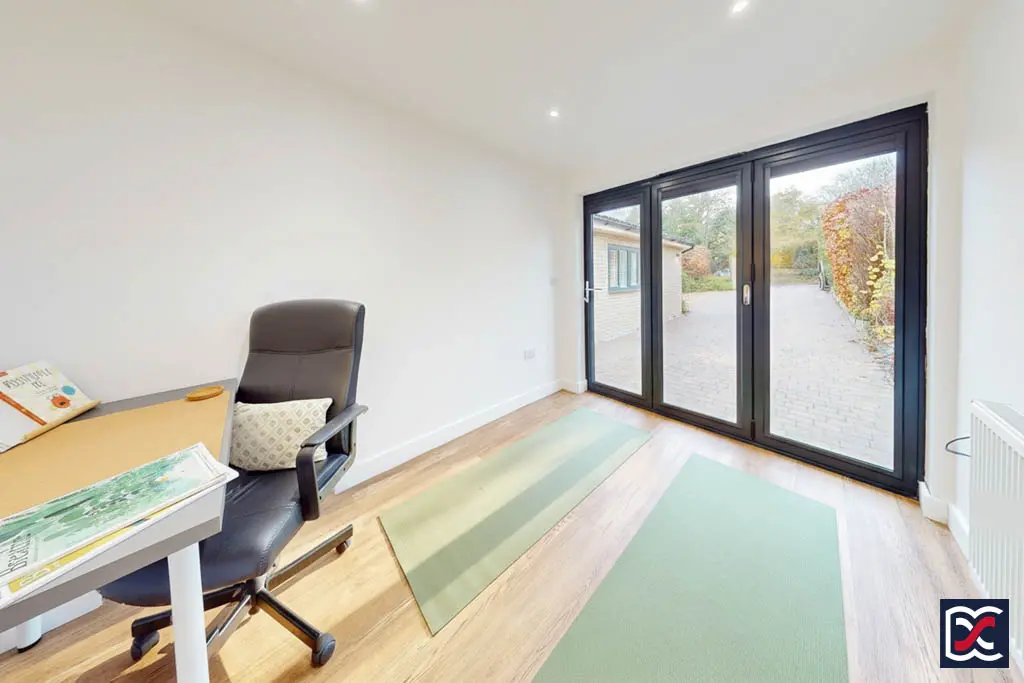 A versatile room featuring full-height triple folding doors to the front aspect, providing excellent natural light. The space is finished with matching oak-effect Karndean flooring and neutral décor, creating a bright and adaptable environment suitable for use as a home office, study, or occasional guest room.