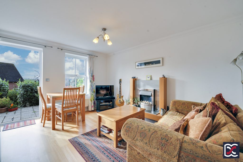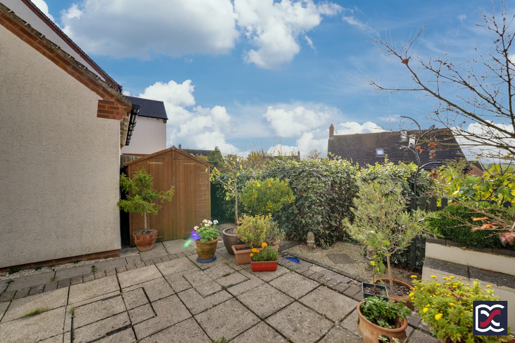 There is gated access to the rear garden via a hard standing pathway which leads to a large patio area at the rear elevation of the property. The rear garden is tiered and features established Ivy hedgerows and steps which lead down to a lower-level grassed area with well-tended perimeter shrubs and trees including a large Fig tree and a Greengage. Boundaries comprise timber close-boarded fencing and there are far reaching south facing countryside views. A useful timber shed on a concrete slab base is situated behind the rear elevation of the garage and there is a pretty water feature to the left-hand side of the patio area.