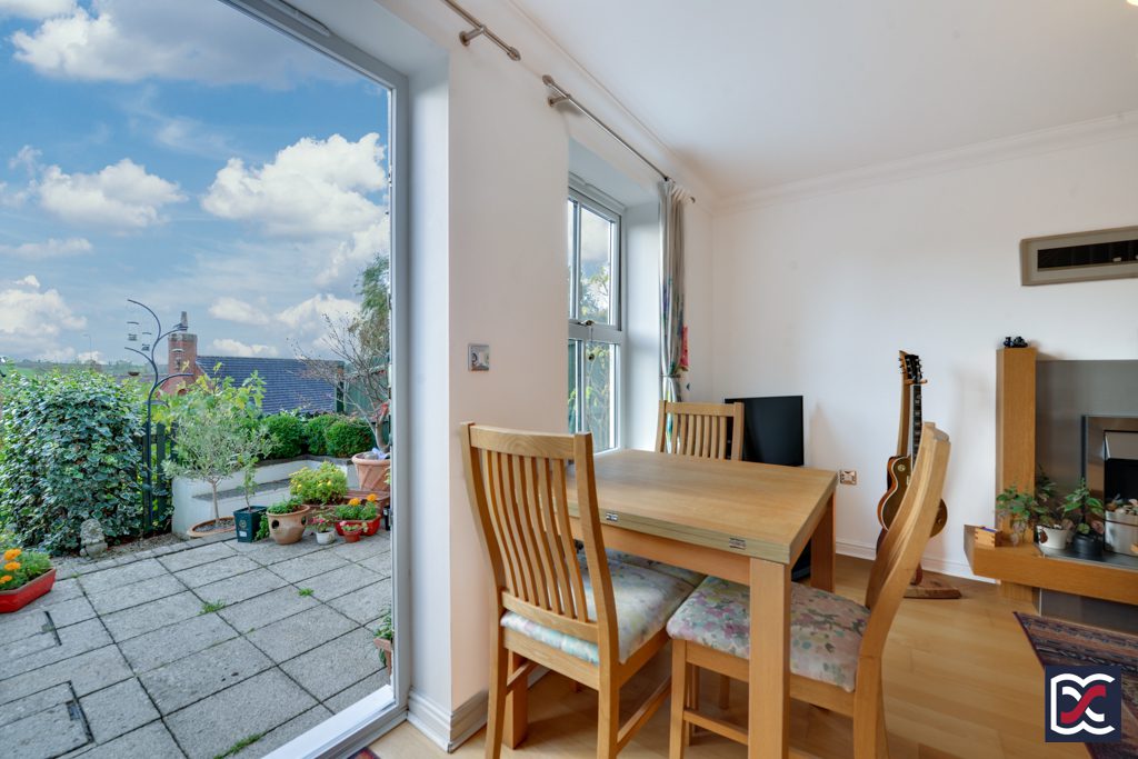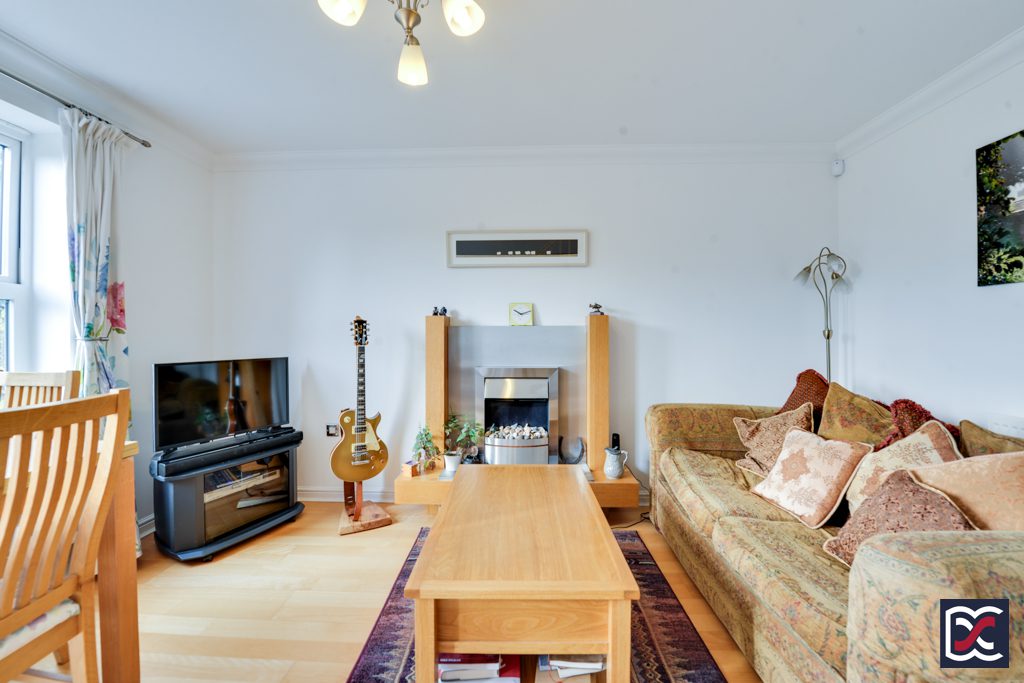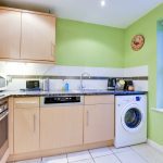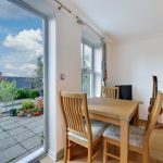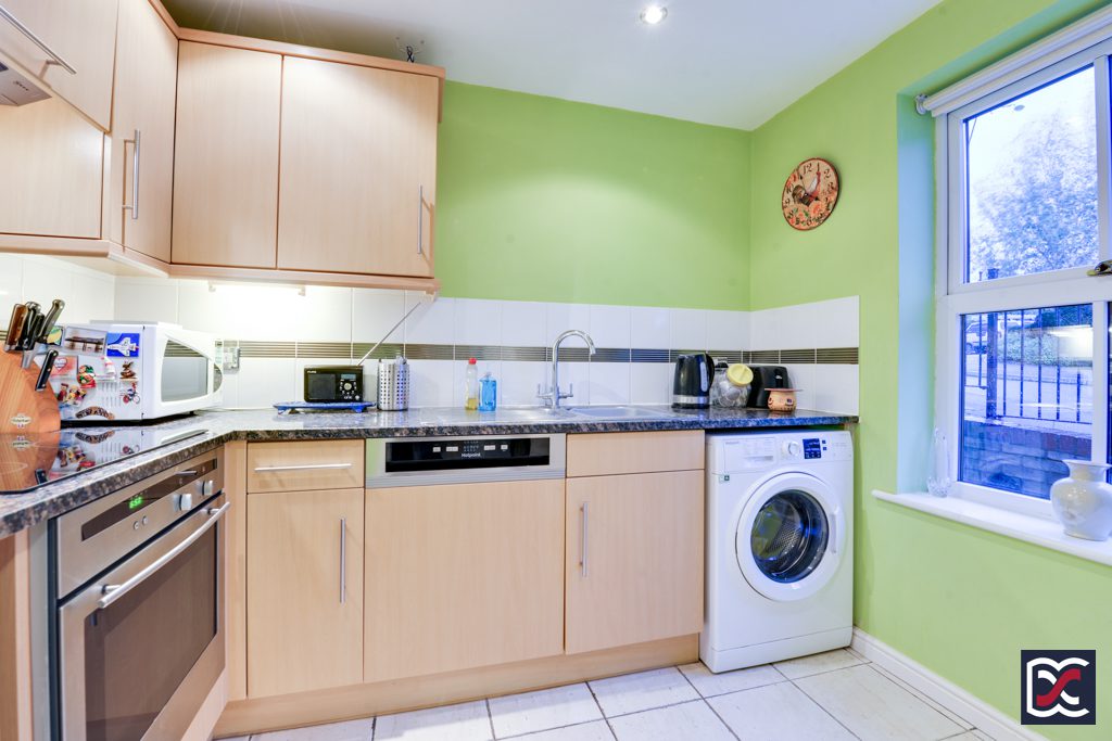 The kitchen is located to the front right-hand side of the property and has a window overlooking the front aspect. Windows throughout the property are double-glazed sash-effect elements with versatile tilt and turn operation to enable easy cleaning and secure ventilation. Artificial lighting is provided by 4 recessed spotlights and floors are finished with lime-stone effect ceramic tiles which flow through from the entrance hall. The kitchen is fitted with a range of base and wall units with brushed chrome handles and solid quartz work surfacing. There is a stainless-steel sink-and-a-half with drainer and mixer tap. White splashback tiles with a profiled black banding have been installed and there is a built-in Bosch induction hob, electric oven, and dishwasher. Space has been provided for a washing machine.