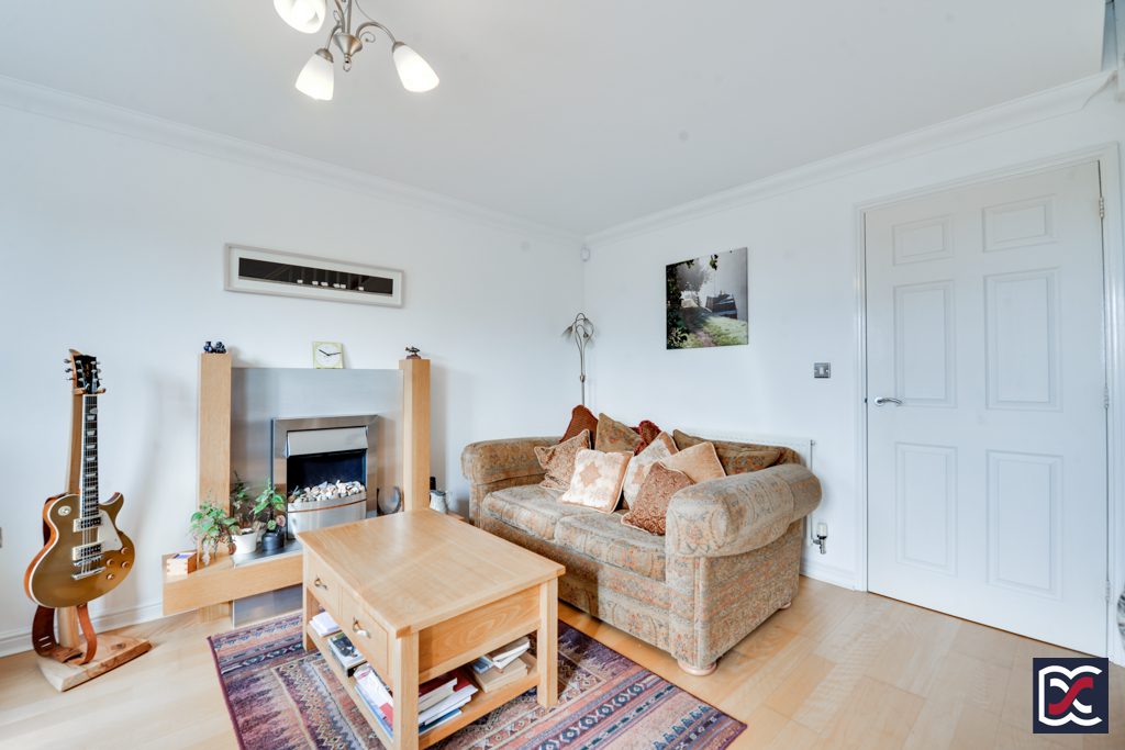The sitting room is located to the rear of the property and has good natural lighting from a large window overlooking the well-tended rear garden and providing far reaching countryside views. There is also a glazed door providing access to the patio area. Floors are finished with oak effect laminate boards and there is a feature oak effect fireplace with brushed chrome electric fire insert. A straight flight of carpeted stairs with painted handrails and balustrades leads to the first-floor accommodation.