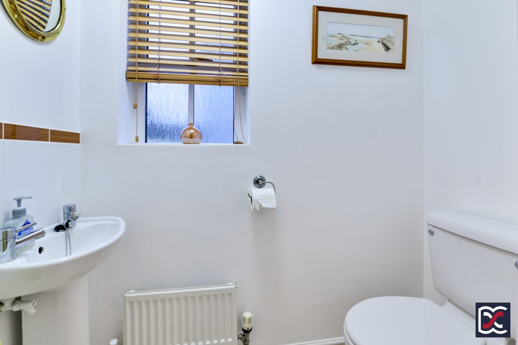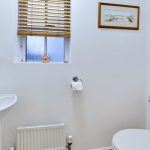 The useful ground floor cloakroom is fitted with a close-coupled WC, and wash-hand-basin with ceramic pedestal. Floors are finished with matching limestone effect ceramic tiles and there is a window to the side elevation providing natural lighting.