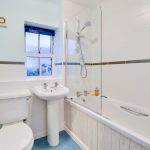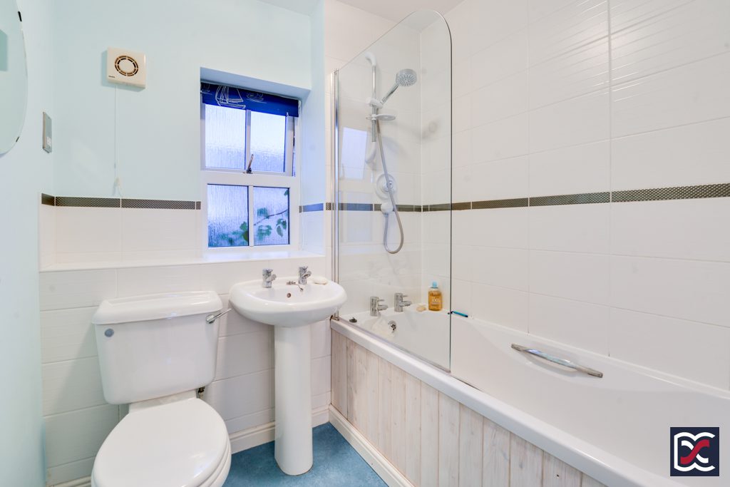 The family bathroom is located to the rear elevation of the property and is fitted with 3-piece suite comprising close-coupled WC, wash-hand-basin with ceramic pedestal and chrome pillar taps, and bath tub with shower over. Walls are partly finished with white ceramic tiles with a single banding detail and floors are finished with marble effect sheet vinyl. There is a window to the front elevation providing natural lighting and mechanical extract ventilation is installed.