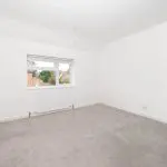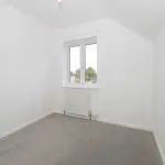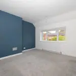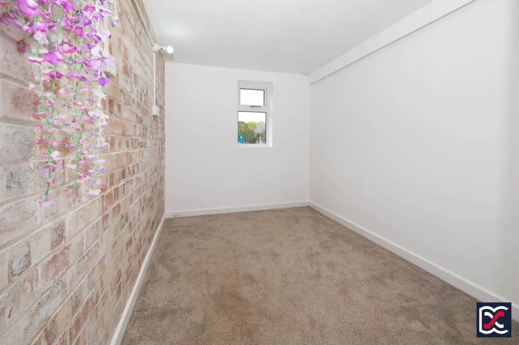 A further well-proportioned double bedroom located to the front left of the property, with a three-unit window overlooking the front aspect. The walls are finished in two-tone emulsion, and the floor is laid with cut-pile carpet. Storage is provided by an open-fronted wardrobe with hanging rail and shelf, together with additional high-level cupboards fitted with double swing doors.