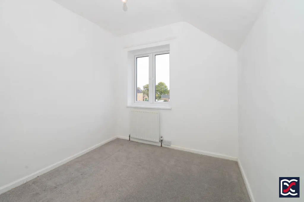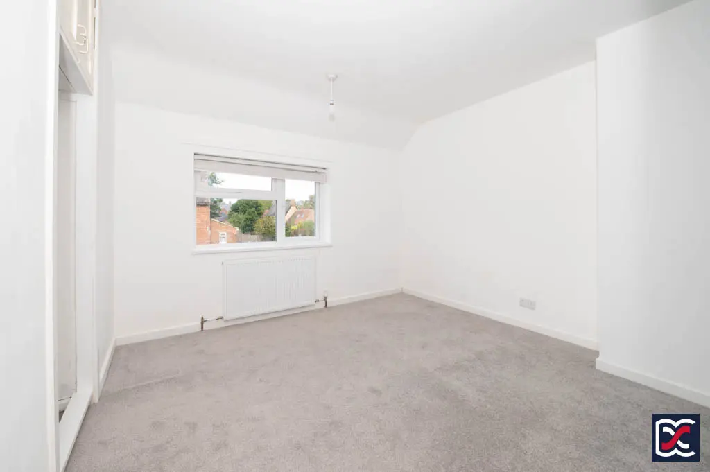 Situated to the front of the property, Bedroom One is a part-vaulted room with a large four-unit double-glazed casement window providing excellent natural light and views to the front aspect. The walls are finished in two-tone emulsion, and the chimney breast includes a blocked fireplace with vent. The floor is laid with cut-pile carpet, and a fitted four-door wardrobe with upper shelving and hanging rail provides useful storage.