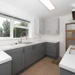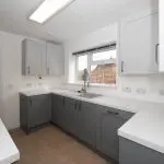 Positioned at the rear of the property, the kitchen enjoys garden views through a three-unit window. It is fitted with a range of shaker-style base and wall units, complemented by terrazzo-effect work surfaces and an acrylic sink with drainer and chrome mixer tap with pull-out hose. Space is provided for an oven and hob, with a brushed chrome extractor hood and light over. The floor is finished with marble-effect vinyl tiles, and a useful under-stairs cupboard houses the modern consumer unit and electric meter. A part-glazed door leads to the rear lobby.