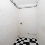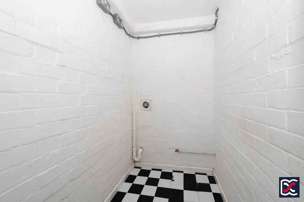 A practical space with plumbing for a washing machine and high-level surface-mounted power points. The floor is finished with checkerboard tiling, while the walls are of exposed brickwork with a painted finish.