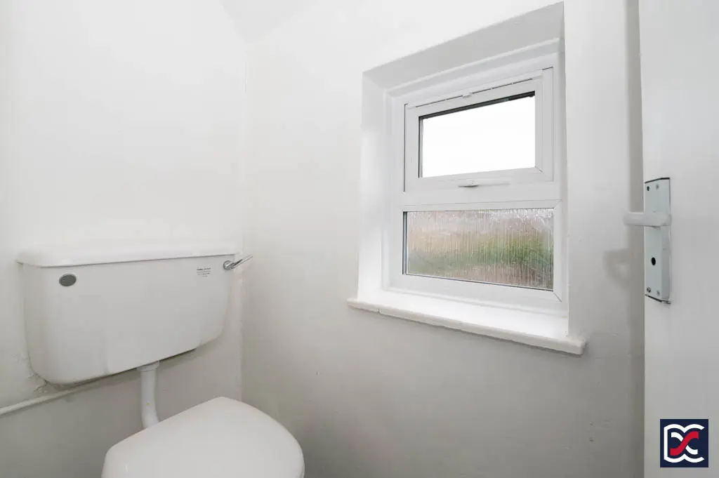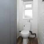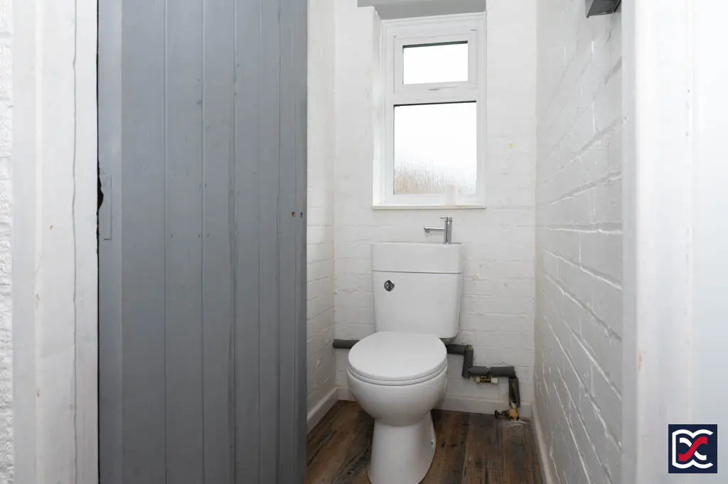 Fitted with a space-saving close-coupled WC with integrated cistern and a wash hand basin with chrome mixer tap. Natural light is provided by a frosted double-glazed casement window to the rear aspect. The exposed brick walls have been finished in white paint, with timber-effect laminate flooring continuing from the lobby.