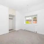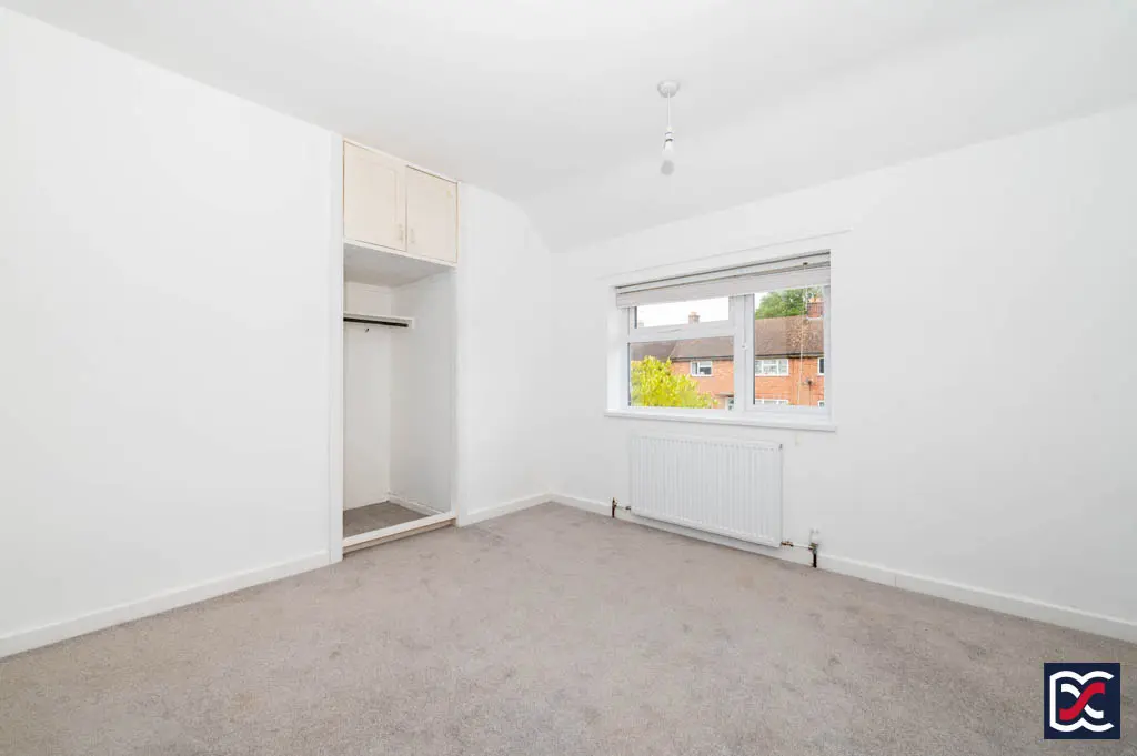 A single bedroom situated to the rear left of the property, with a two-unit casement window overlooking the garden. The room includes a built-in storage cupboard with upper shelving. The floor is laid with cut-pile carpet, and the walls are neutrally decorated.