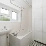 Located to the rear right of the property, the bathroom is fitted with a two-piece suite comprising a bath with shower over and a pedestal wash hand basin with chrome pillar taps. A frosted three-unit window provides natural light and ventilation, supplemented by a wall-mounted extractor fan. The floor is finished with geometric-pattern sheet vinyl. A built-in four-door timber cupboard houses the hot water cylinder, with slatted pine shelving above providing useful laundry storage.