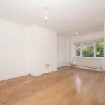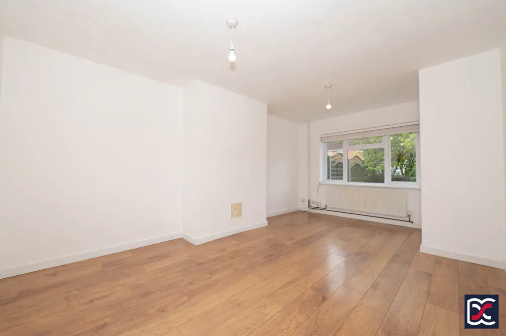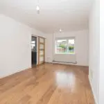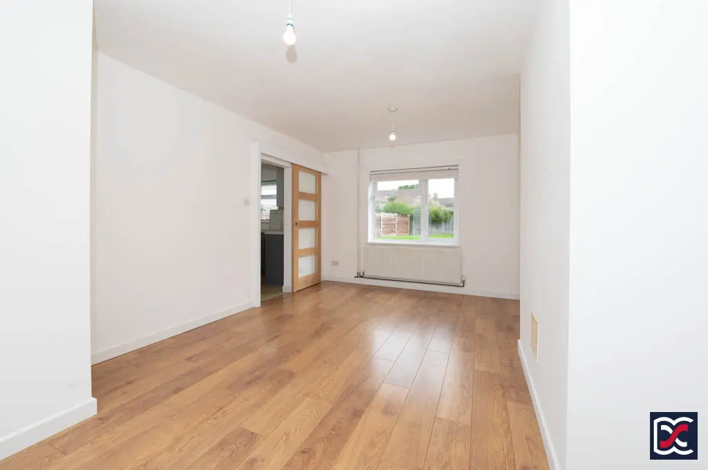 This generously proportioned dual-aspect room is finished with oak-effect laminate flooring, continuing from the entrance hall. Double-glazed casement windows to the front and rear provide excellent natural light. The original fireplace has been blocked and vented, and the walls are neutrally decorated in off-white tones. The front area would accommodate lounge seating, while the rear is suited for dining, with a glazed sliding door opening directly to the kitchen.