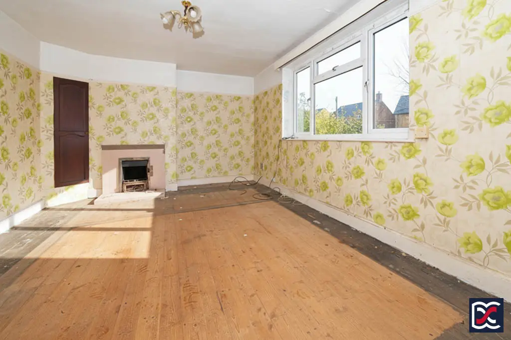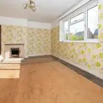A generously proportioned reception room centred on an open fireplace with an original 1950s tiled surround and matching hearth. The room retains exposed floorboards and picture rails, with walls currently finished in embossed paper. Natural light is provided by a double-glazed window to the front elevation, and a panelled door opens through to the kitchen.