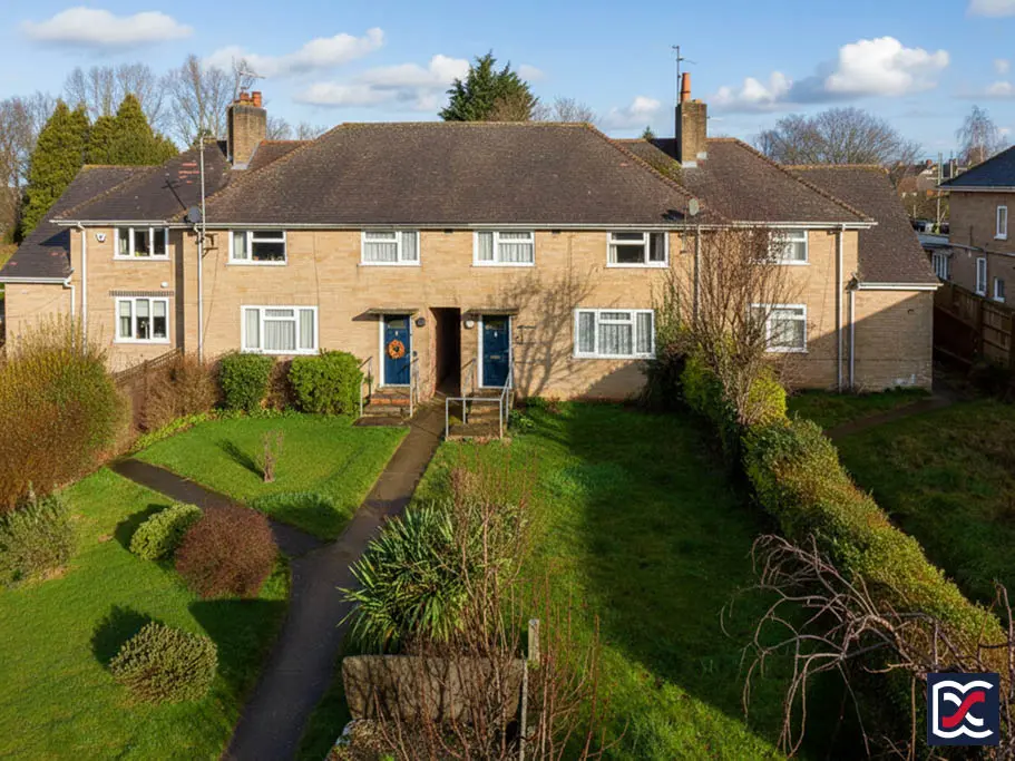 Set back from Farthingstone Road, the property is approached via a shared pedestrian pathway and benefits from a generous front garden, predominantly laid to lawn with established planting and maintained shrub borders. A path leads to the front entrance and continues along the left-hand side of the terrace to provide access to the rear garden. A dropped kerb and metal double swing gates open to a hardstanding area providing off-road parking for one vehicle.