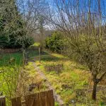 The substantial rear garden is predominantly laid to lawn, with a pathway along the left-hand side and a patio area directly adjoining the house. Mature borders incorporate a variety of established shrubs and trees, providing structure and privacy. Steps with grab rails lead down from the kitchen to the patio, creating a practical transition between the house and garden. A gated side access connects to the shared passageway leading to the front.