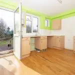 The kitchen retains its original arrangement and is fitted with a range of base and wall units, together with a stainless-steel sink and drainer set beneath a double-glazed window overlooking the rear garden. There is built-in storage via an under-stairs cupboard, providing useful space for household items and cleaning equipment. The walls incorporate ceramic tiles above base units, and a part glazed door opens directly to the rear garden.