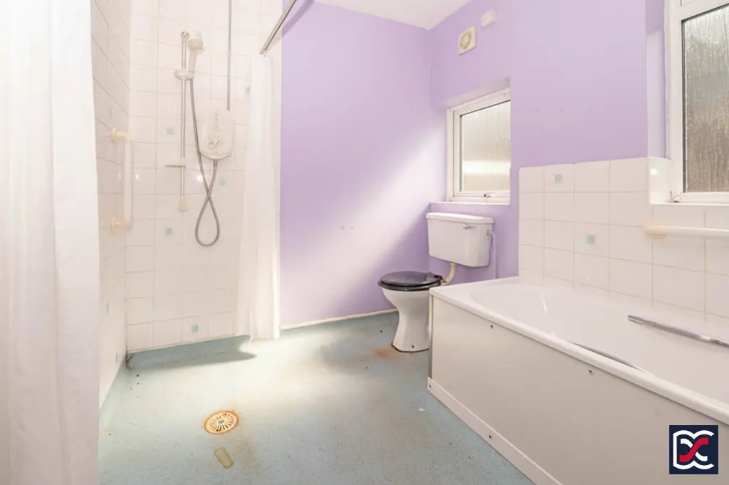 The ground-floor bathroom is fitted with a four-piece suite comprising a pedestal wash-hand basin, low-level WC, panelled bath and a walk-in shower with riser rail and curtain rail. Two obscured double-glazed windows to the rear elevation provide natural light and ventilation. A wall-mounted electric heater is installed.