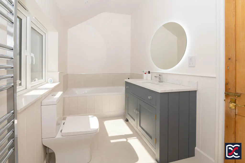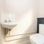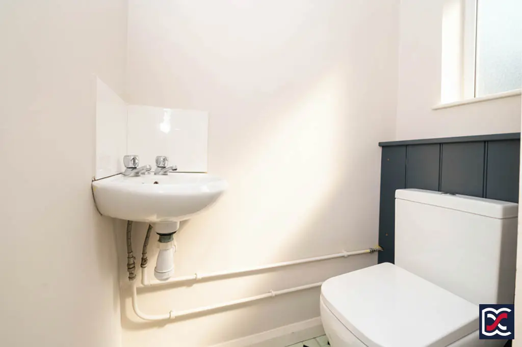 Fitted with a close-coupled WC and corner wash-hand basin with tiled splashback. A high-level casement window provides natural light and ventilation.