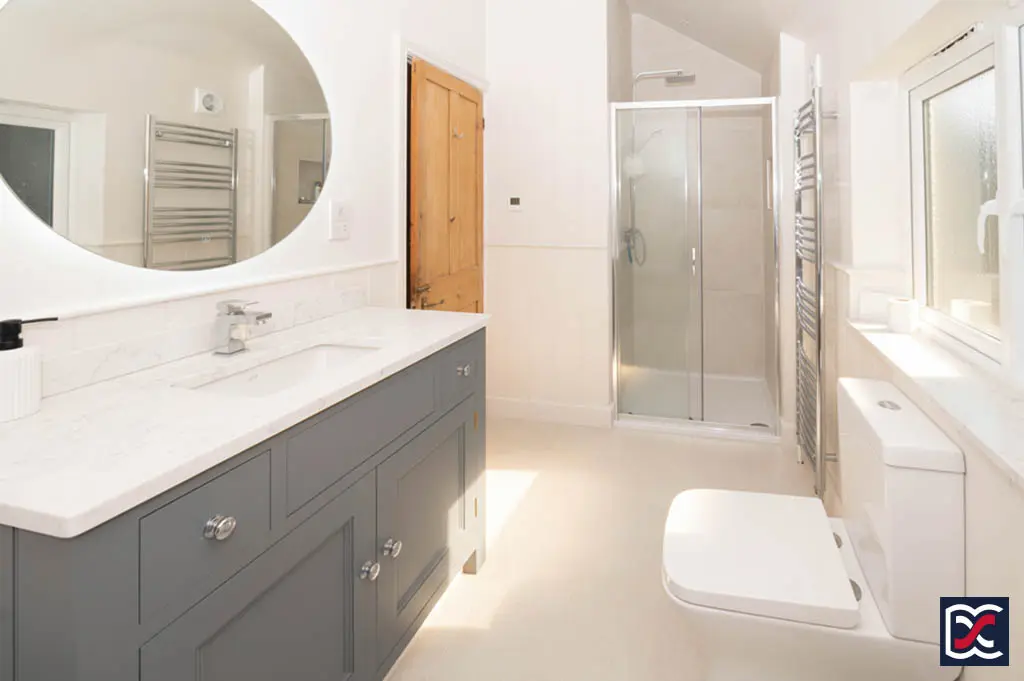 Fitted with a newly installed four-piece suite comprising a shower cubicle with sliding glazed screen, close-coupled WC, panelled bath with chrome mixer tap, and an inset wash-hand basin set into a marble worktop with upstand, incorporating a Shaker-style vanity unit below.
