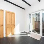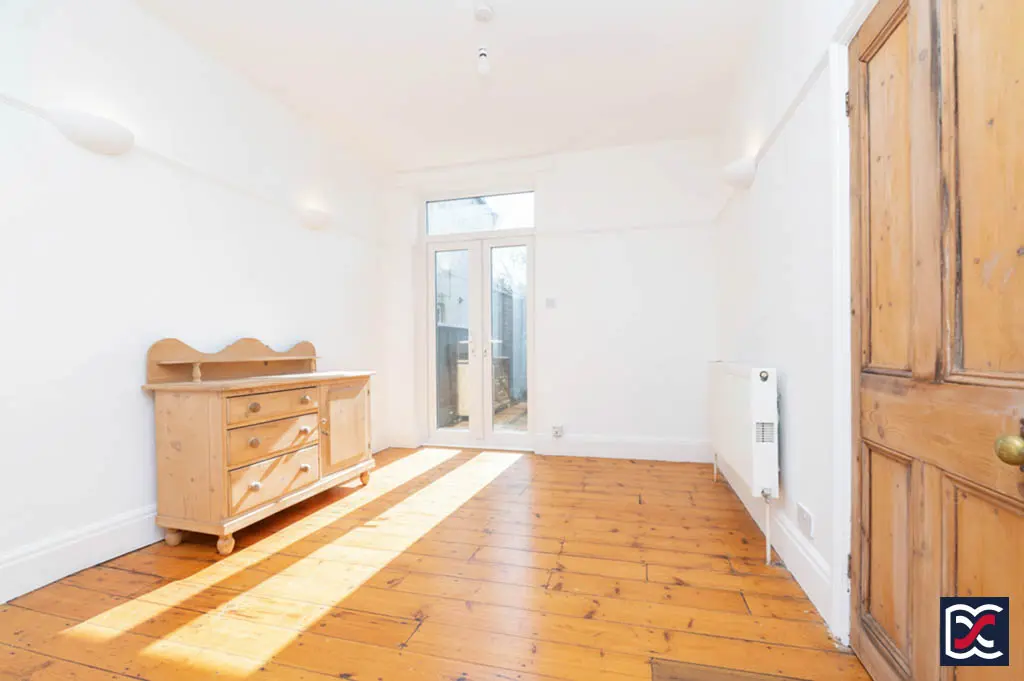 An open connection leads through to the dining area, which continues the exposed pine floorboards and neutral décor with matching picture rail and uplighters. There is ample space for a full-size dining table and additional furniture. French doors with overlight open directly onto the rear garden, further enhancing the light and providing convenient outdoor access.