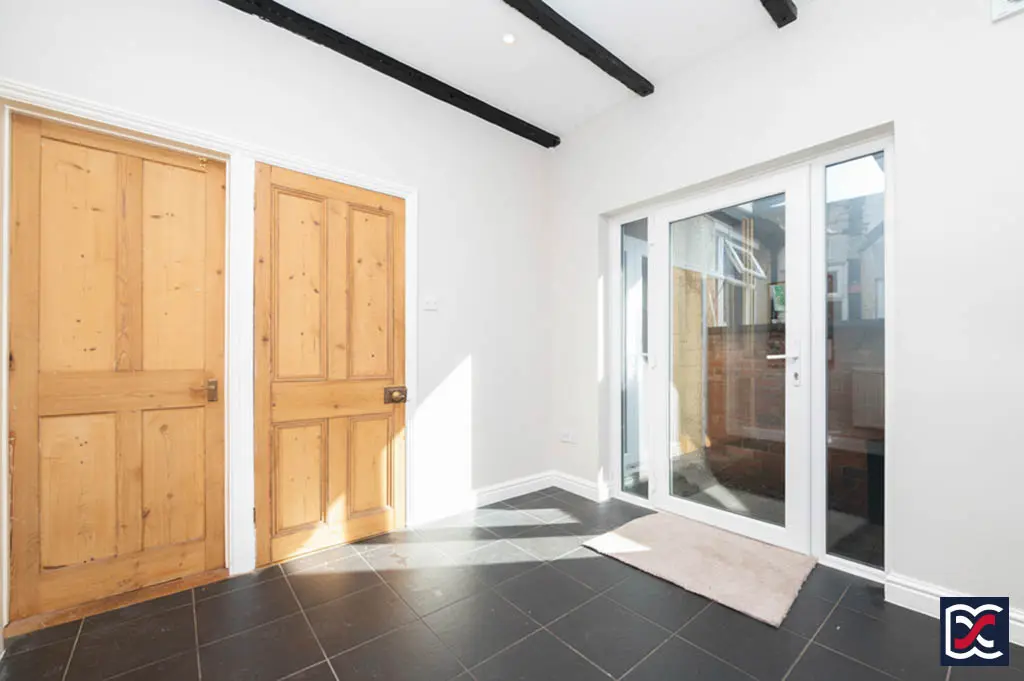 The attractive Victorian frontage incorporates a segmental bay to the front elevation and sits directly on King Edward Road. A recessed entrance porch with a plastered pediment surround and geometric tiled threshold leads to the main front door.