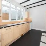 A fridge/freezer and dishwasher are included within the let; however, these are to remain the tenant’s responsibility during the tenancy. Splashbacks are finished in ceramic tiling, with the remaining walls in a bright painted finish. Recessed ceiling spotlights provide task lighting. Within the breakfast area, a full-height double-glazed door with glazed side panels opens directly onto the rear garden, bringing in good natural light and providing convenient outdoor access.