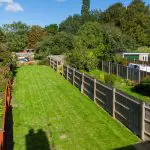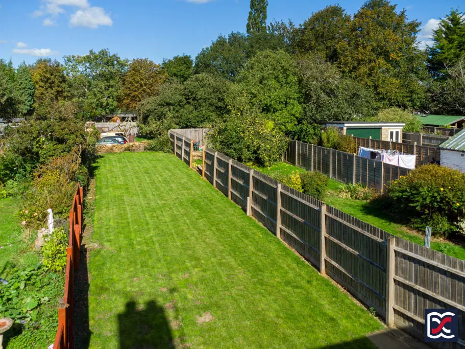 Extending to just over 100 feet, the rear garden benefits from a generous, newly laid lawn, ideal for outdoor activities, bordered by timber fencing, and a dry-stone wall at the rear. A large patio area provides ample space for entertaining, while a two-unit brick outhouse with a pitched, slated roof offers practical storage or potential for a workshop.