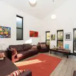 A dual-aspect space with vaulted ceiling and contemporary top-hung windows overlooking the rear garden, supplemented by a further window to the side aspect. Flooring continues in timber-effect luxury vinyl across the open-plan arrangement.
