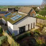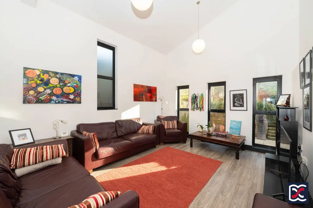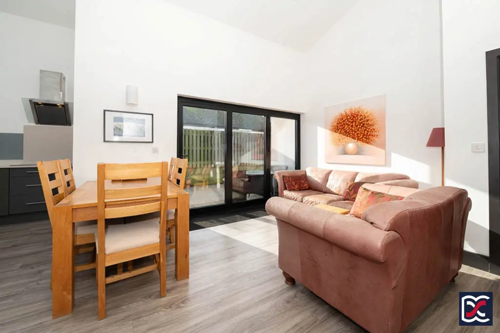 Internally, the accommodation is arranged around a generous open-plan living space designed to maximise natural light and provide a clear connection between inside and out. Vaulted ceilings, rooflights and extensive glazing enhance the feeling of volume, while the layout naturally defines kitchen, dining/snug and sitting areas for day-to-day family living.